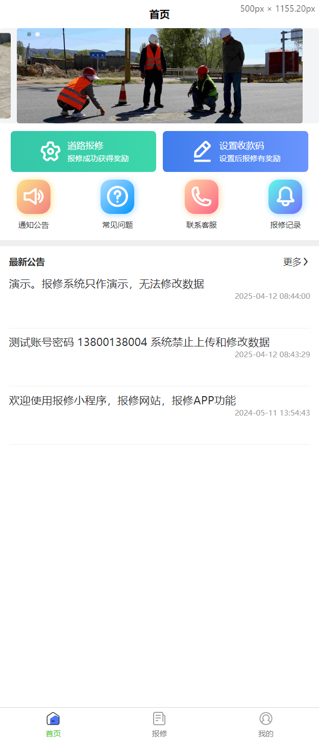 - 欢迎信息:欢迎使用报修小程序、报修网站和报修APP功能。